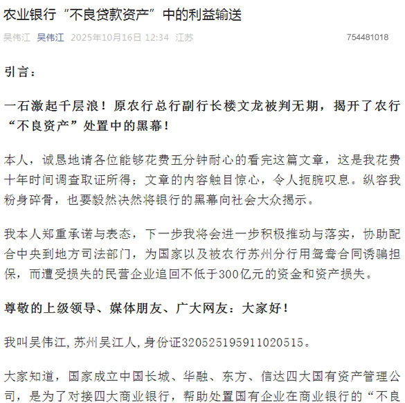 今天,我将用自己十年来调查获取的,原农行苏州分行行长刘加旺及助理兼吴江分行行长陈刚,勾结高利贷人员共谋违法放贷、串通骗贷、非法核销、处置“不良资产”,造成近1000亿元损失中的证据和线索,深刻揭示国有资产管理公司,从获利到亏损这一黑幕与乱象。虽然于我而言,顶着巨大的阻力与压力,但是我无所畏惧,只力求能够真正引起大众和有关部门的关切与重视,欢迎相关调查机关、媒体朋友来人向我索取证据。