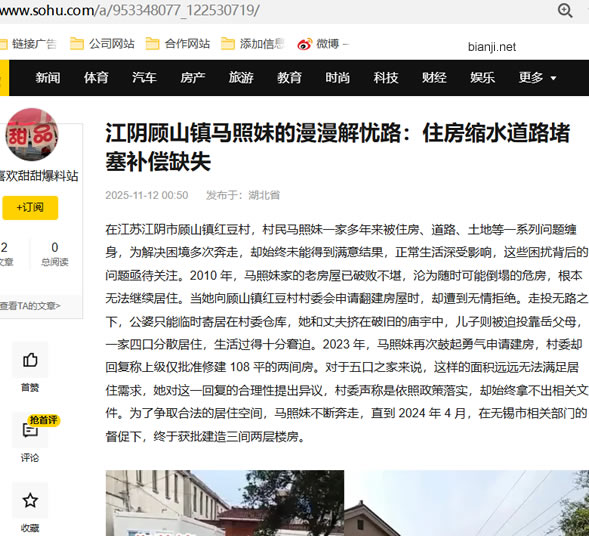 在江苏江阴市顾山镇红豆村,村民马照妹一家多年来被住房、道路、土地等一系列问题缠身,为解决困境多次奔走,却始终未能得到满意结果,正常生活深受影响,这些困扰背后的问题亟待关注。2010 年,马照妹家的老房屋已破败不堪,沦为随时可能倒塌的危房,根本无法继续居住。当她向顾山镇红豆村村委会申请翻建房屋时,却遭到无情拒绝。走投无路之下,公婆只能临时寄居在村委仓库,她和丈夫挤在破旧的庙宇中,儿子则被迫投靠岳父母,一家四口分散居住,生活过得十分窘迫。2023 年,马照妹再次鼓起勇气申请建房,村委却回复称上级仅批准修建 108 平的两间房。对于五口之家来说,这样的面积远远无法满足居住需求,她对这一回复的合理性提出异议,村委声称是依照政策落实,却始终拿不出相关文件。为了争取合法的居住空间,马照妹不断奔走,直到 2024 年 4 月,在无锡市相关部门的督促下,终于获批建造三间两层楼房。