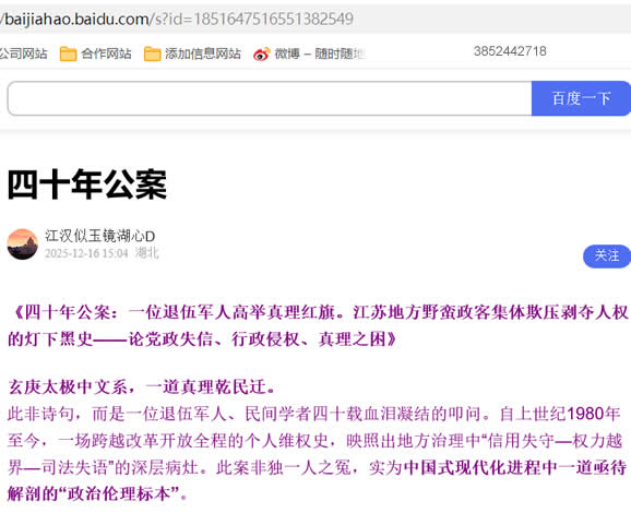 此非诗句,而是一位退伍军人、民间学者四十载血泪凝结的叩问。自上世纪1980年至今,一场跨越改革开放全程的个人维权史,映照出地方治理中“信用失守—权力越界—司法失语”的深层病灶。此案非独一人之冤,实为中国式现代化进程中一道亟待解剖的“政治伦理标本”。
