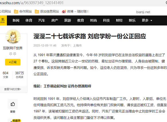 从 1991 年首次遭遇权益侵害至今,今年 68 岁的刘启学已在主张合法权益的道路上走过了 27 个春秋。这段跨越近三分之一世纪的历程,牵扯出证件办理受阻、人身自由被限制、健康受损、诉求反映无果等一系列问题。如今,这位老人仍在坚持,只为寻求一份迟到多年的公正回应。