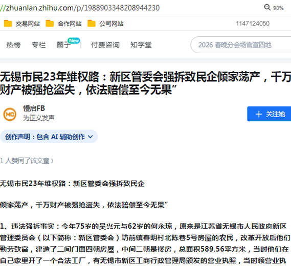 23年来,吴兴元为了维权,依法逐级上访了上千次,每星期四上午,吴兴元夫妻俩都到新吴区信访局上访,并多次向国家信访局网上信访,要求新吴区人民政府和江溪街道办事处实事求是依法赔偿26大卡车合法财产和23年停工停产的损失。后在 2025年9月8日,国家信访局将该信访事项转交江苏省信访局处理,经逐级转交,江溪街道办事处于2025年9月15日受理。然而,时任江溪街道书记周某不仅未实事求是依法赔偿解决,反而继续推诿拖延,于2025年11月12日向当事人出具“依法履职告知书”,以“没有实际经营”“营业执照被吊销”等理由不肯实事求是依法赔偿解决,继续推诿拖延,受理至今一次也没有出来谈赔偿!对此,吴兴元夫妇反问周某:你“依法履职告知书”依的哪条法?履的哪个职?我们用钱买来实际经营的26大卡车生产资料难道是天上掉下来的吗?我们营业执照被吊销是因工厂被新区管委会违法强拆掉、生产资料被新区管委会抢夺去偷盗干净,导致无法正常经营验照,并非自身原因,完全是新区管委会违法强抢偷盗造成的。他们表示,2016年在江苏省高级人民法院(以下简称“省高院”)申请再审“无锡市人民政府新区管理委员会限期拆除通知书”的行政案件时,无锡市新吴区人民政府和江溪街道办事处已明确表示愿意协调化解本案争议,并向省高院出具了调解解决的承诺书。省高院据此作出(2016)苏行申1345号行政裁定书,明确本案由政府调解解决,不需进入再审程序。江溪街道书记周某长期推诿拖延,无视省高院调解裁定,拒不实事求是依法赔偿解决,严重行政不作为,按照《信访工作条例》第四十五条,应当依法追究违法行政责任!