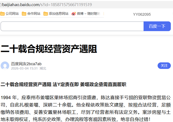 二十载合规经营资产遇阻 法Y定责在即 姜堰政企亟需直面履职