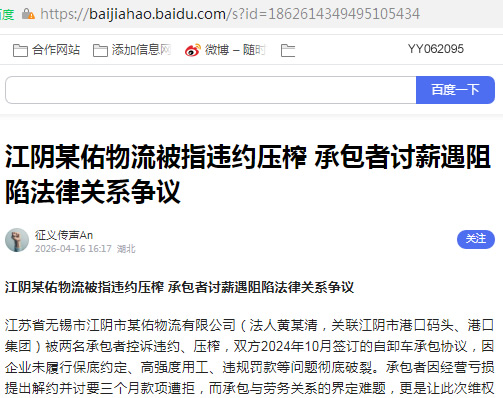 江阴某佑物流被指违约压榨 承包者讨薪遇阻陷法律关系争议
